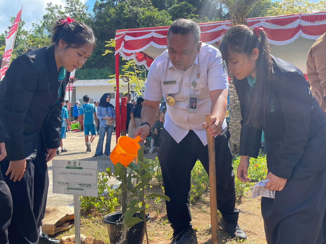 Kepala Kantor Imigrasi Entikong, Henry Dermawan Simatupang, turut menanam pohon bersama peserta kegiatan. Ia menilai langkah kecil seperti ini menjadi simbol nyata semangat kebersamaan dan kepedulian lintas generasi.